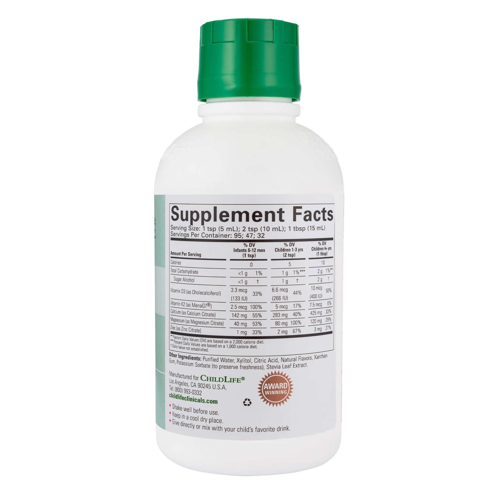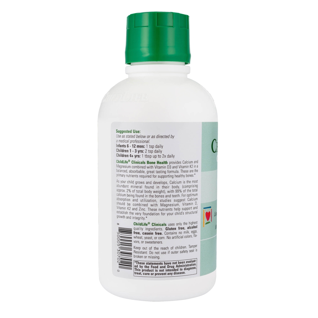 Thực phẩm bổ sung tăng cường sức khỏe ChildLife Clinicals Bone Health, từng đoạt giải thưởng, cung cấp Canxi và Magie kết hợp với Vitamin D3 và Vitamin K2 trong một công thức cân bằng, dễ hấp thụ và có vị ngon. Đây là những dưỡng chất chính cần thiết để hỗ trợ xương chắc khỏe. Khi trẻ lớn lên và phát triển, Canxi là khoáng chất dồi dào nhất trong cơ thể (chiếm khoảng 2% tổng trọng lượng cơ thể), với 99% tổng lượng canxi nằm trong xương và răng. Để hấp thụ và sử dụng tối ưu, các nghiên cứu cho thấy Canxi nên được kết hợp với Magie, Vitamin D, Vitamin K2 và Kẽm. Những dưỡng chất này giúp hỗ trợ và thiết lập nền tảng vững chắc cho sự phát triển cấu trúc và sự toàn vẹn của xương trẻ.