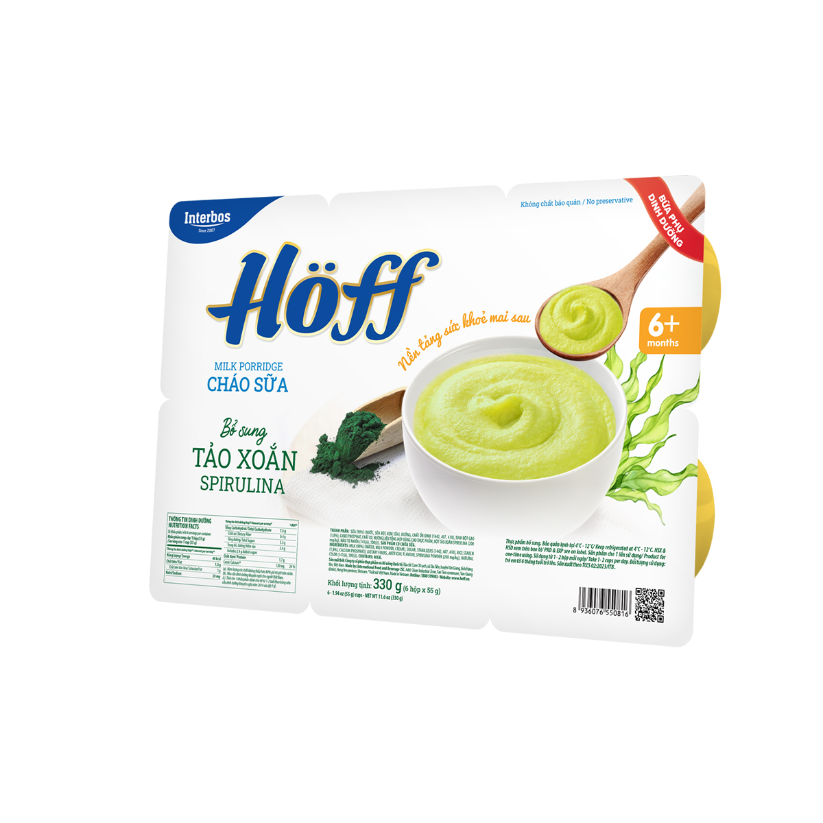 Cháo sữa bổ sung Tảo xoắn Spirulina Hoff là bữa phụ dinh dưỡng cho trẻ trong giai đoạn ăn dặm đầu đời. Sản phẩm là sự kết hợp từ Sữa, Tảo xoắn và Bột gạo được làm chín cung cấp đầy đủ chất dinh dưỡng: Chất đạm, Chất béo, Vitamin, Khoáng chất cần thiết, cung cấp năng lượng mỗi ngày cho trẻ, đặc biệt là trẻ biếng ăn, chậm lớn.
