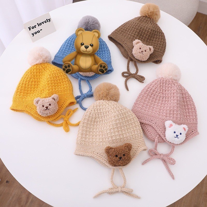 Mũ len quả bông đính gấu