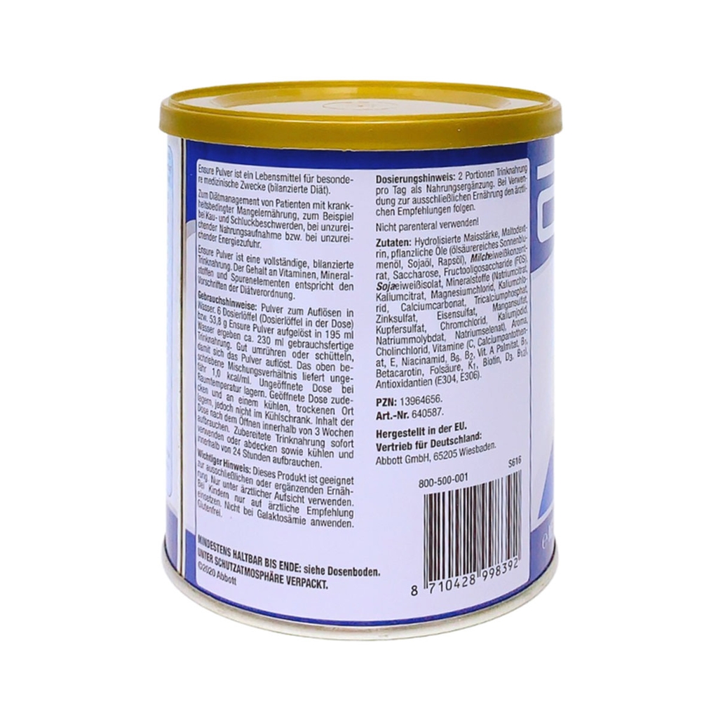 Sữa Ensure Đức là sản phẩm nổi tiếng và được ưa chuộng của hãng Abbott sản xuất dành cho thị trường Đức có hàm lượng chất dinh dưỡng cao gồm protein, canxi, vitamin, khoáng chất, kháng thể tự nhiên IgG ... giúp hỗ trợ bồi bổ, phục hồi sức khỏe, tốt cho xương và hỗ trợ tăng sức đề kháng cho người gầy, người suy dinh dưỡng đặc biệt người già người sau phẫu thuật, người mới ốm dậy.
