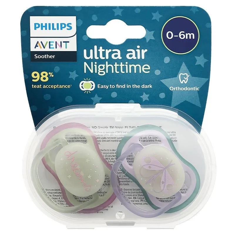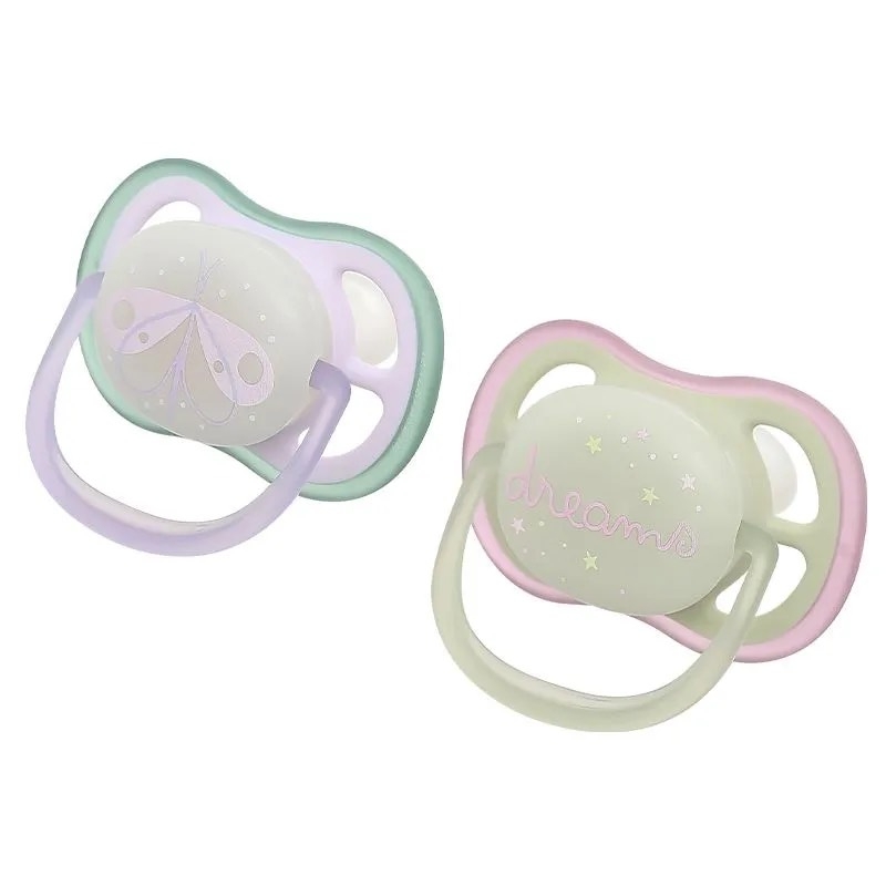 - Ty ngậm ban đêm Philips Avent Ultra Air Night nổi bật với thiết kế nút phát quang trong tối, giúp bé dễ dàng tìm thấy ty ngậm khi tỉnh giấc, đồng thời cũng để bố mẹ tiện quan sát và tìm thấy bé trong đêm.
