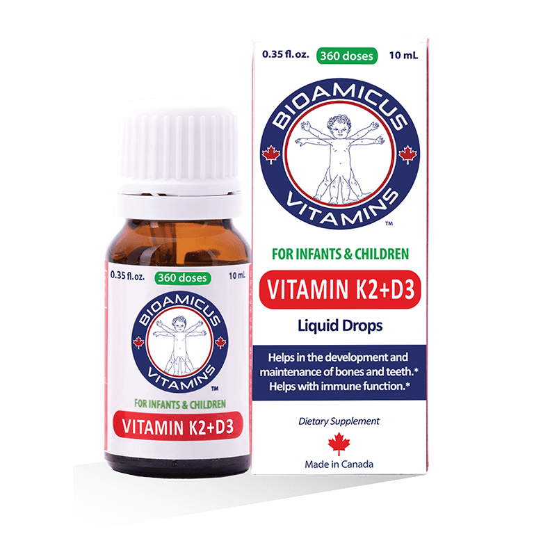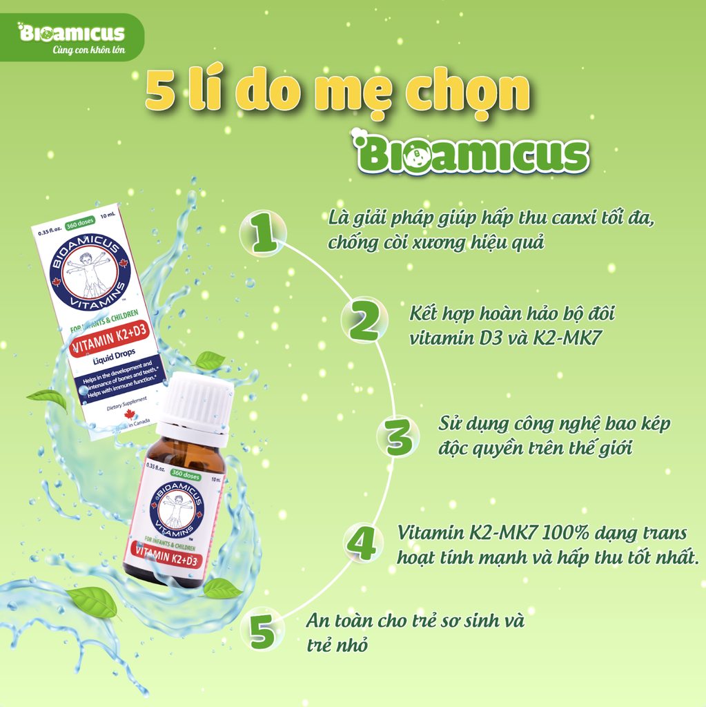 - Bioamicus Vitamin D3K2 với tác động kép: Vitamin D3 giúp tăng cường hấp thu canxi tại ruột, Vitamin K2-MK7 giúp gắn kết Canxi vào xương. Bổ sung bộ đôi D3K2 là giải pháp tối ưu khắc phục tình trạng thiếu canxi, giúp xương chắc khỏe, phát triển chiều cao vượt trội cho trẻ trong 1000 ngày đầu đời.