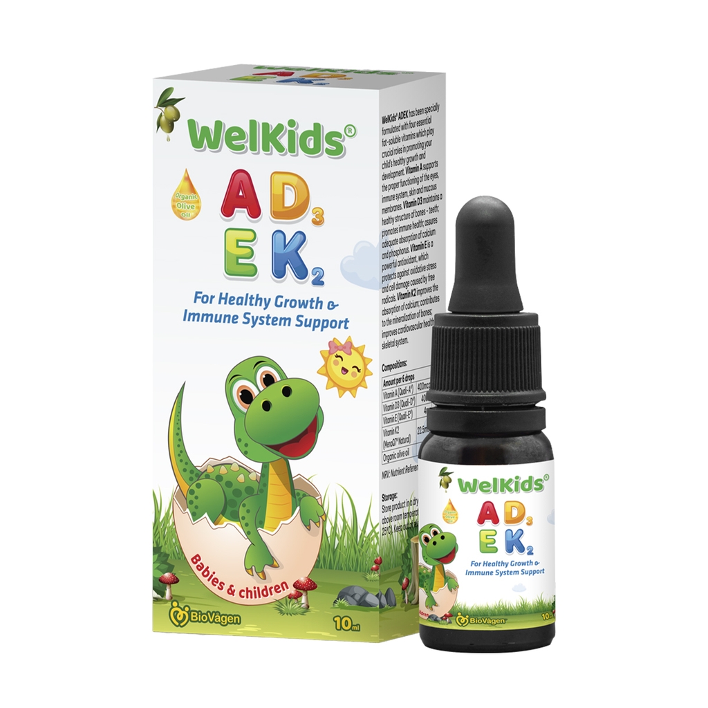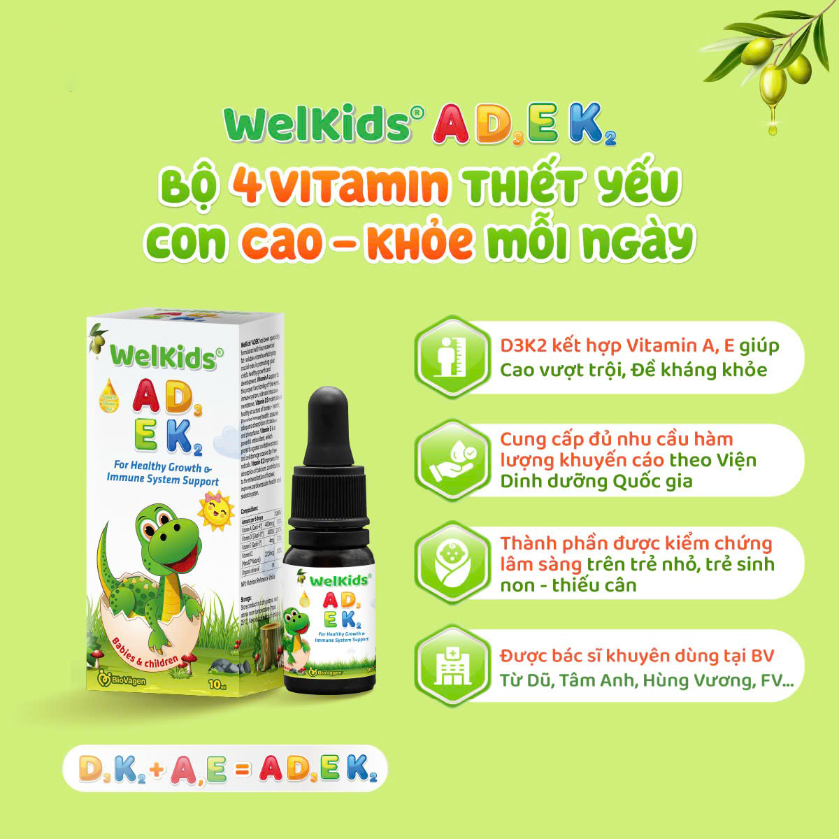- Vitamin WelKids Adek 10ml duy nhất bổ sung D3K2 kết hợp Vitamin A, E với hàm lượng chuẩn khuyến cáo